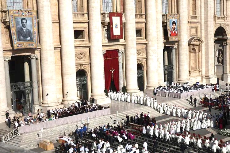 Sulla facciata della Basilica vaticana campeggiano due ritratti. A sinistra, in giacca e cravatta, c’è Frassati, giovane alpinista e terziario domenicano torinese morto nel 1925 all’età di 24 anni per una meningite virale. A destra, con una maglietta rossa, quello di Acutis, studente milanese morto nel 2006 a 15 anni per una leucemia fulminante.