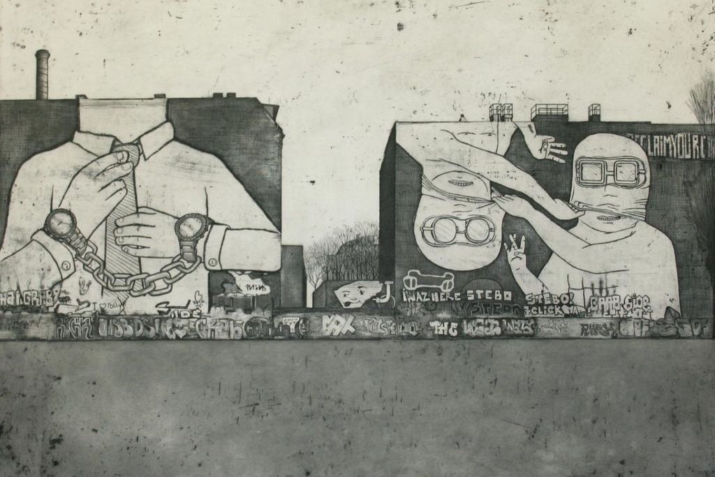 Edward Hopper, mentre l’attenzione ai graffiti e alla Street Art lo lega alla riflessione sulla fragilità dell’immagine urbana. Con l’acquatinta Banksy was here documenta l’opera di Banksy a Napoli prima che fosse protetta da una vetrina; emblematico è anche Kreuzberg, che ritrae un celebre intervento di Blu a Berlino, successivamente cancellato. In questo modo, Pigni si fa testimone e archivista della memoria urbana, custodendo i muri come palinsesti vivi, prima che il tempo o le trasformazioni della città li cancellino o li sovrascrivino.