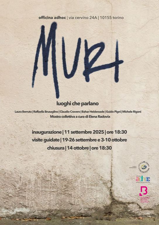 La mostra MURI riunisce sei artisti – Laura Berruto, Raffaella Brusaglino, Claudio Cravero, Bahar Heidarzade, Guido Pigni e Michele Rigoni – che esplorano questo tema in chiave fisica e simbolica, intrecciando linguaggi diversi: fotografia, pittura, collage, incisione, installazione. Attraverso un mosaico di opere l'open space di via Cervino si trasforma in un paesaggio di confini e passaggi, che riflette non solo sulla città contemporanea, ma sulla nostra condizione umana: sempre in bilico tra chiusura e apertura, separazione e incontro, allontanamento e vicinanza. Una condizione fragile e universale, che i muri rivelano e al tempo stesso nascondono. Uno spazio da attraversare, da ascoltare, da cogliere nelle sue poetiche sfumature che gli artisti hanno saputo raccontare con differenti linguaggi, sguardi e sensibilità.