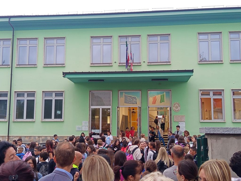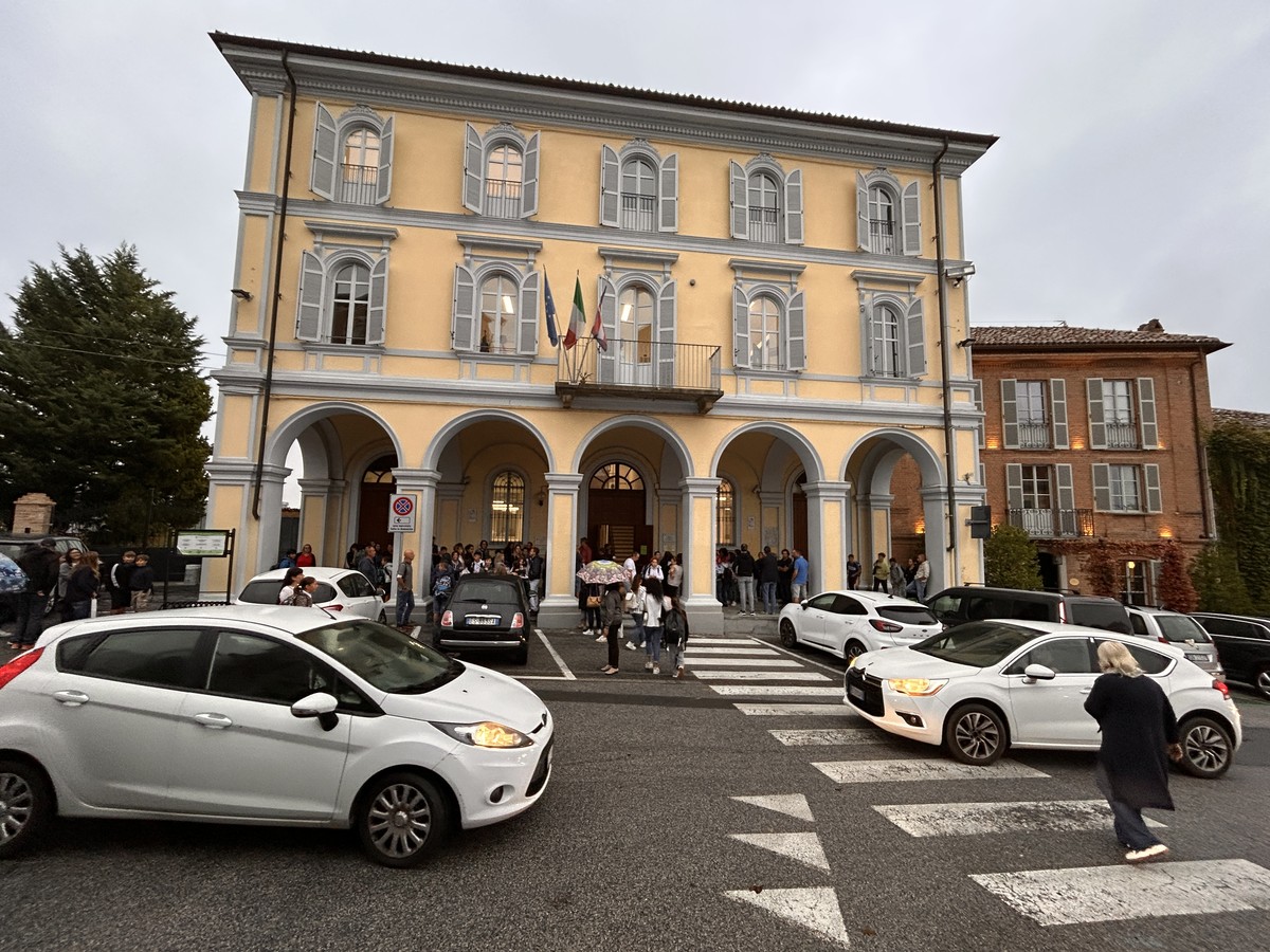 [L'ingresso degli studenti alle scuole medie di Priocca, nel Roero]