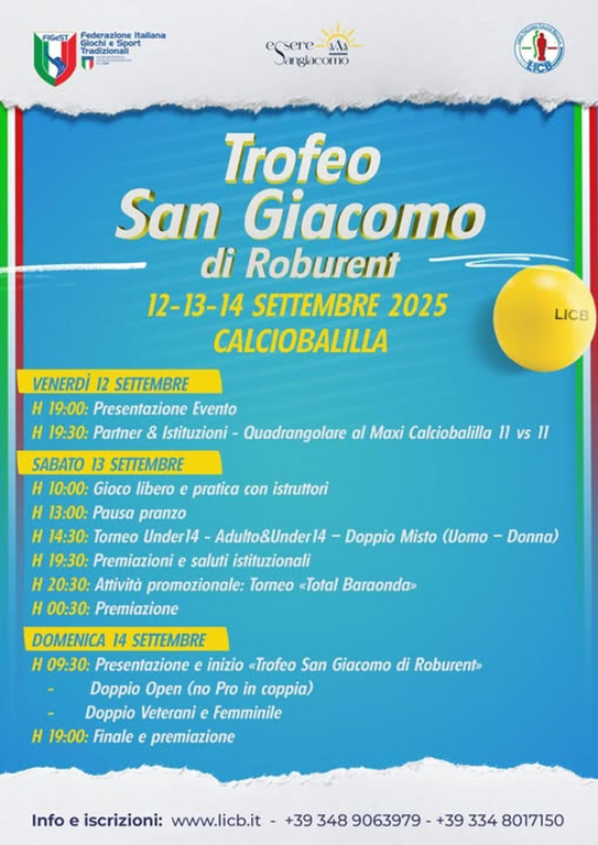 L'evento, organizzato dalla FIGeST Federazione Italiana Giochi e Sport Tradizionali in stretta collaborazione con l'associazione locale Essere San Giacomo, punta a coinvolgere grandi e piccoli, e sarà presentato venerdì 12 settembre alle 19 e, subito dopo, alle 19.30 prenderà il via lo speciale "quadrangolare al Maxi calciobalilla" 11 contro 11, tra partners e istituzioni del territorio.
