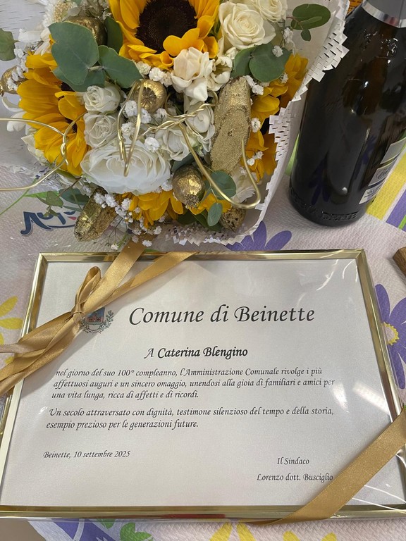 Così recita la targa che il Comune di Beinette ha donato alla signora Caterina Blengino che ieri, mercoledì 10 settembre, ha compiuto 100 anni.