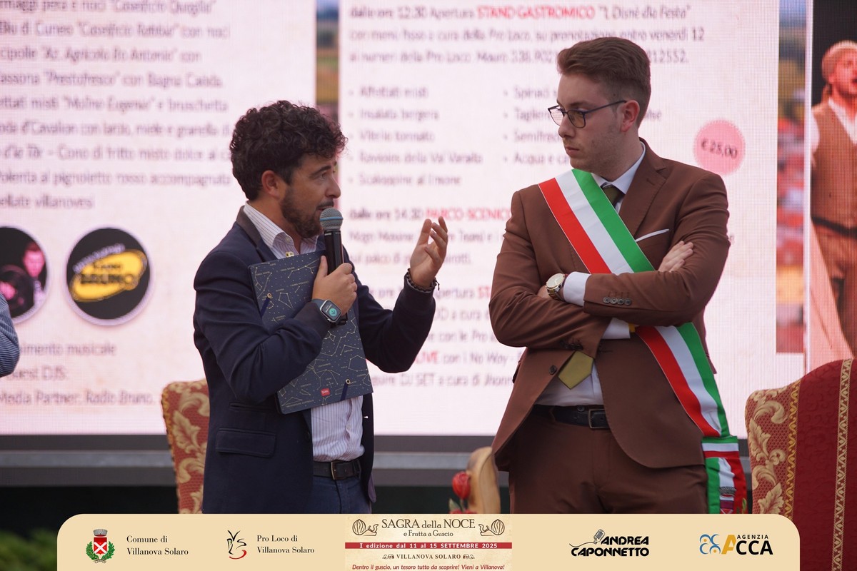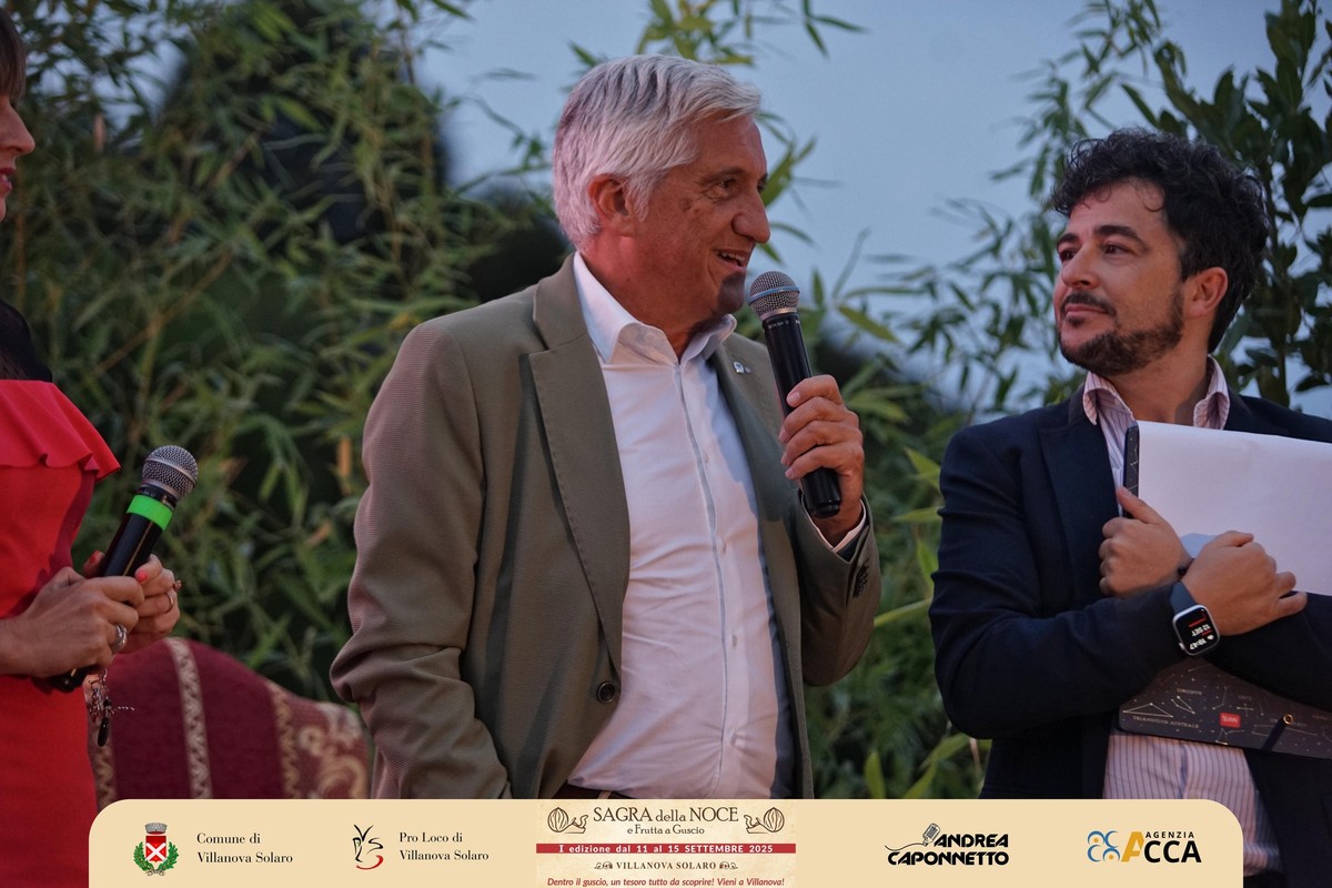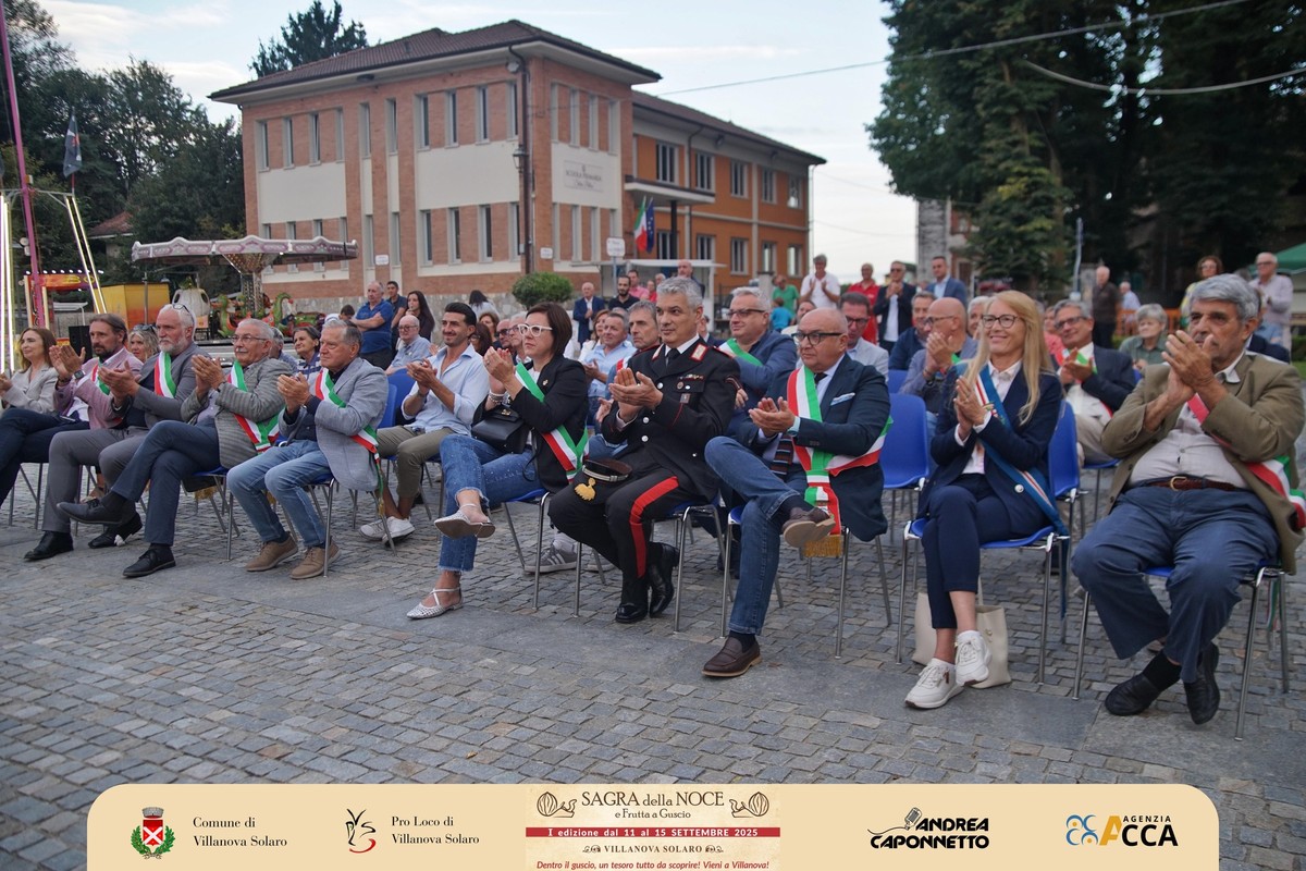 Dopo il convegno del pomeriggio, lo scrigno di piazza Pairotti a Villanova Solaro ha accolto l’inaugurazione ufficiale della prima Sagra della Noce e della Frutta a Guscio: un momento che ha sancito l’avvio della kermesse davanti a un pubblico numeroso e partecipe, con tanti ospiti sul palco. A presentare l’evento Andrea Caponnetto e Ilaria Salzotto.