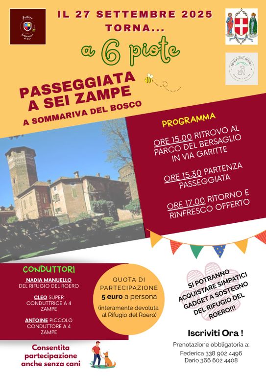 Sabato 27 settembre, a Sommariva del Bosco, torna la "Passeggiata a Sei Zampe", un evento che unisce la passione per la natura e l'amore per gli animali, organizzato in collaborazione tra la Pro loco sommarivese e il Rifugio del Roero di Ceresole d'Alba.