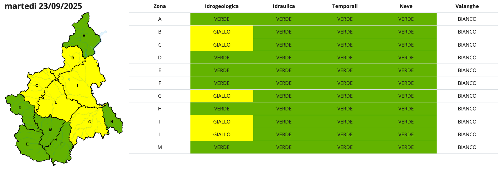 Esclusa, rispetto a ieri, la Valle Po, mentre analogo livello di attenzione è prescritto per domani, mercoledì 24.