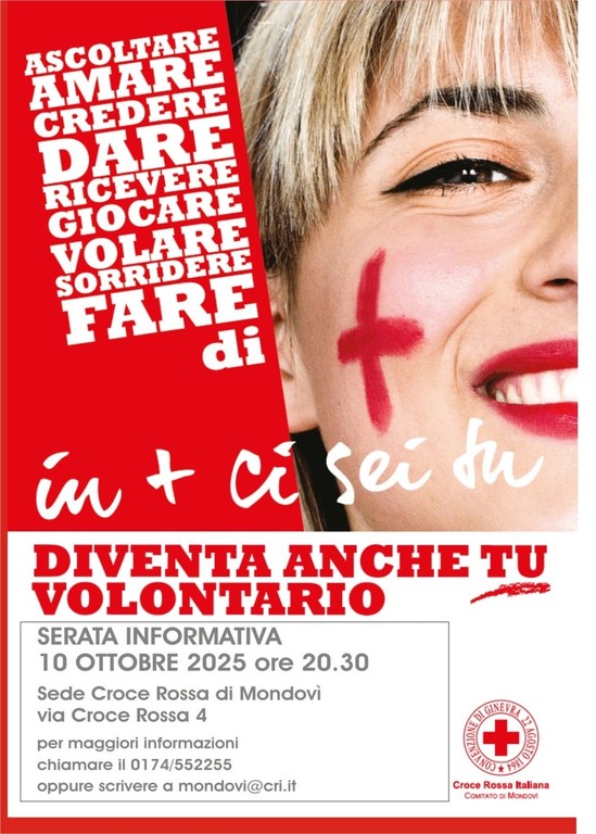 Venerdì 10 ottobre alle 20.30, presso la sede della Croce Rossa Italiana – Comitato di Mondovì, in via Croce Rossa 4, si terrà una serata informativa aperta dedicata a chi desidera conoscere le modalità di adesione al nuovo corso di formazione per diventare volontari della Croce Rossa Italiana.