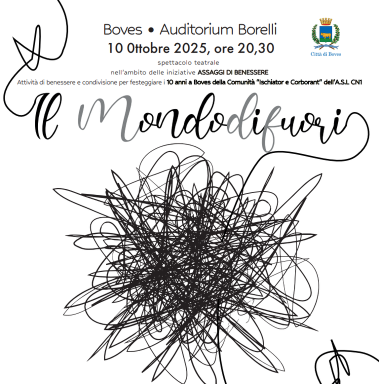 Sempre il 10 ottobre si conclude il percorso “Assaggi di Benessere” con una rappresentazione teatrale presso il Teatro Borelli, sito in Piazza Borelli a Boves, alle ore 20,30 dal titolo: “Assaggi di benessere: concludere per ripartire-Nuovi orizzonti di benessere”, in collaborazione con l’Associazione MenteInPace ed il Servizio di Riabilitazione Psico-Sociale/ Struttura Residenziale Psichiatrica 2.2 Ischiator e Corborant di Boves, che, quest'anno, festeggia il decimo anno di apertura.