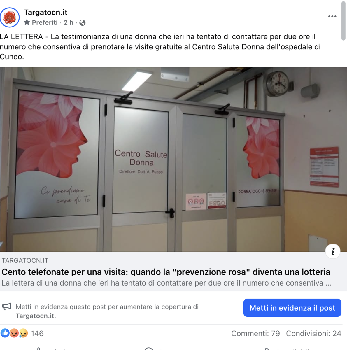 Sono decine e decine le donne che, commentando sui social di Targatocn la lettera ricevuta e condivisa, hanno raccontato la stessa esperienza: impossibile prendere la linea per prenotare le visite gratuite messe a disposizione dal Centro Salute Donna di Cuneo nel mese di ottobre, tradizionalmente dedicato alla prevenzione al femminile.