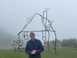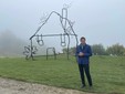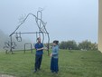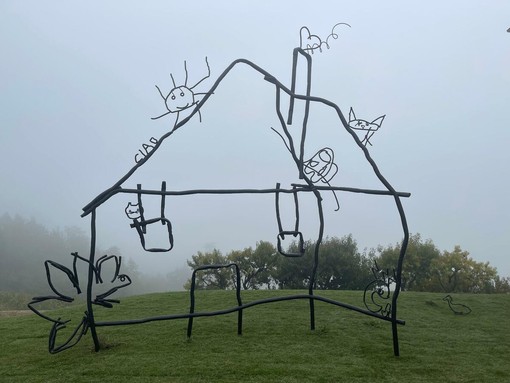 Abetare (un giorno a scuola), 2025. Disegni e scarabocchi dei banchi delle scuole di Dogliani e dei Balcani è la prima opera permanente del progetto Abetare, da cui trae il titolo, una serie di opere che Halilaj porta avanti dal 2015, e dà forma alla casa stilizzata incisa su un banco da una bambina o da un bambino di una scuola di Dogliani. L’artista ha assemblato tubi di acciaio piegati e ritorti per riprodurre fedelmente il disegno, rendendo uno scarabocchio fugace un’opera scultorea e permanente. Come racconta il titolo, Halilaj ha dato vita a una nuova scuola immaginaria, popolata da creature, scritte e simboli provenienti sia dai banchi delle Langhe sia dei Balcani. L’opera è un crocevia di segni e figure di diverse aree geografiche, un incontro che diventa una celebrazione gioiosa dell’immaginazione e della fantasia, della libertà e del gioco di bambine e bambini di ogni luogo e di ogni tempo.