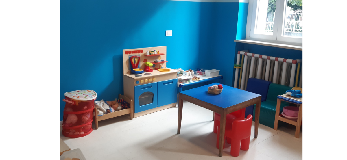 Anche il giardino esterno ha beneficiato dell'intervento: sono state risistemate le pavimentazioni, restaurati alcuni giochi e seminata l'erba che in primavera creerà un morbido tappeto verde dove i bambini potranno giocare in sicurezza.