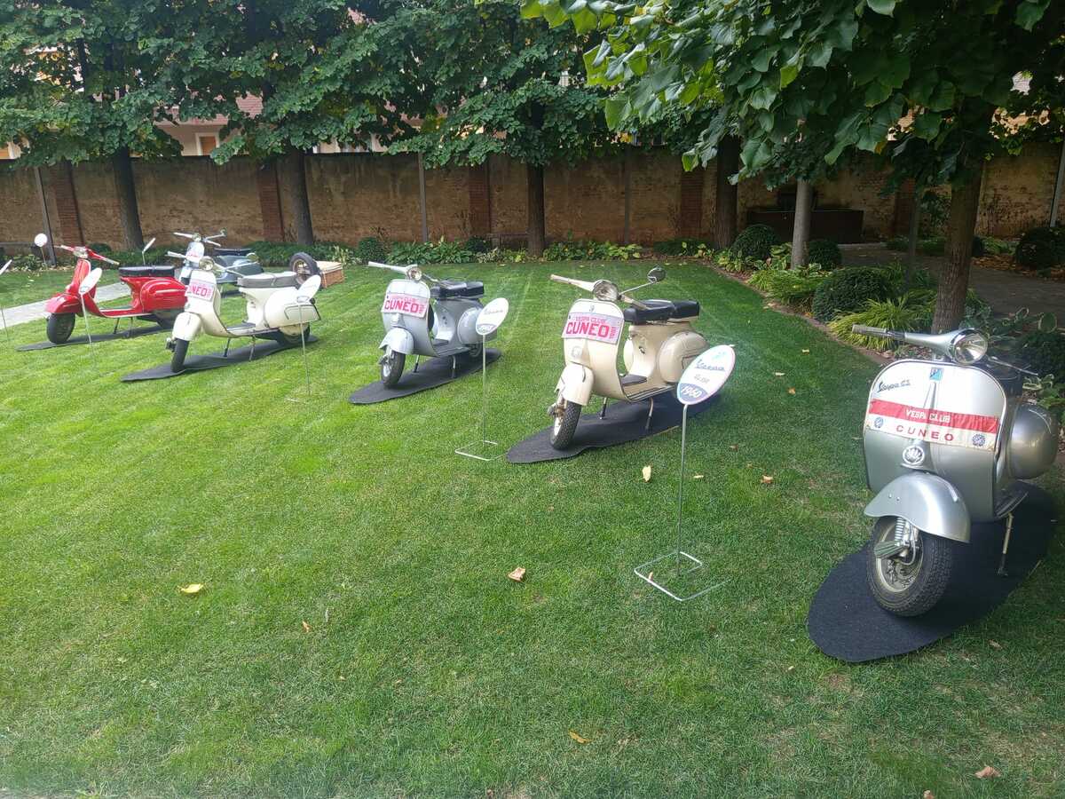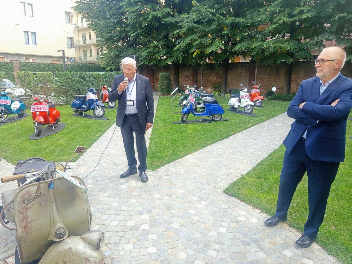 Si è svolta oggi, sabato 4 ottobre, al parco "Amilcare Merlo" di via Bersezio, sede di Confindustria Cuneo, l'inaugurazione dell'esposizione dedicata al mito italiano delle due ruote: la Vespa.