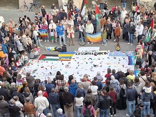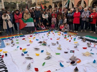 A colorare la piazza, le bandiere della pace e della Palestina che sventolavano accanto a un grande lenzuolo bianco, sul quale i partecipanti hanno deposto barchette di carta colorate, simbolo della Flotilla e della speranza di pace.