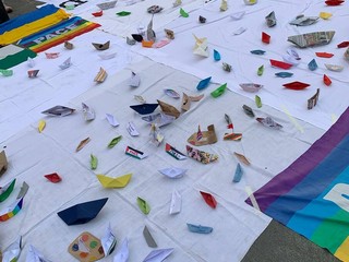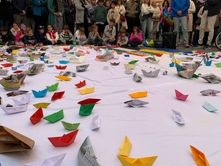 Il momento più simbolico è stato quello delle barchette di carta: bambini e adulti hanno continuato a posarle sul lenzuolo fino a riempirlo, e al termine dell’evento gli organizzatori hanno invitato tutti a prenderne una e portarla a casa, come gesto di vicinanza alla Flotilla e di impegno personale per la pace.