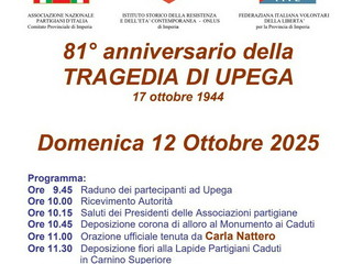 Si svolgerà domenica 12 ottobre, a Upega, frazione del Comune di Briga Alta (Cuneo), la cerimonia per l’81° anniversario della tragedia di Upega, avvenuta il 17 ottobre 1944 durante l’occupazione nazifascista. L’iniziativa, organizzata dall’A.N.P.I. di Imperia in collaborazione con l’Istituto Storico della Resistenza e dell’Età Contemporanea di Imperia (ISRECIm) e con la F.I.V.L. di Imperia, intende mantenere viva la memoria dei caduti partigiani vittime del rastrellamento del 16-17 ottobre 1944.