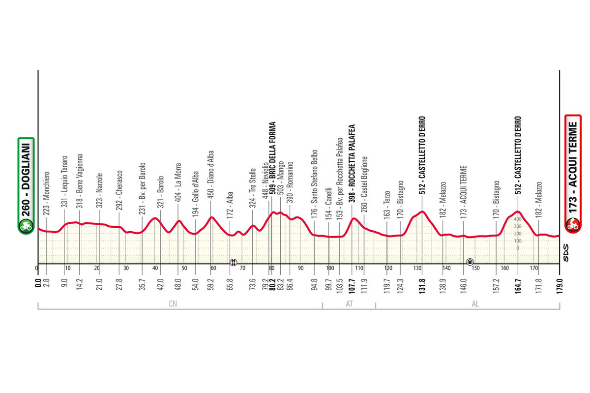 Il percorso, di 179 km con 2800 metri di dislivello, presenta numerose asperità altimetriche tra cui il Bric della Forma (4,4 km al 6.3%) e la Rocchetta Palafea (2,7 al 8.4%). A decidere la corsa sarà però la doppia ascesa a Castelletto d’Erro, erta di 6,1 chilometri con pendenza media del 5.3% (primi 2600 metri al 9.3%). L’ultima salita terminerà a 14,3 km dal traguardo, di cui 7000 metri di discesa e altrettanti di pianura, fino al centro abitato di Acqui Terme.