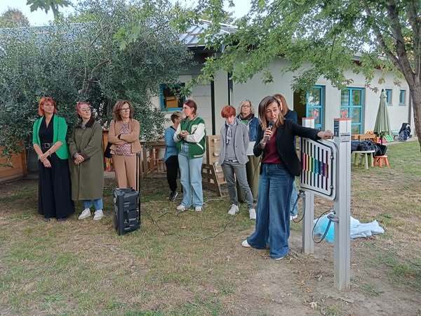 Durante la piccola cerimonia, i bambini e i genitori hanno potuto provare il nuovo strumento, collocato nel cortile dell’asilo, che da oggi arricchirà le attività musicali e ludiche della scuola.