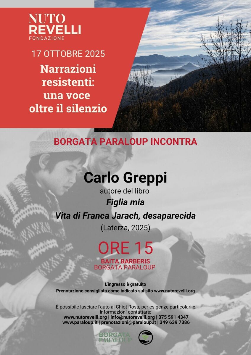 Venerdì 17 ottobre, ore 15, appuntamento a Borgata Paraloup insieme a Carlo Greppi, storico e autore di numerosi saggi sul Novecento, per un incontro dedicato al suo ultimo libro" Figlia mia. Vita di Franca Jarach, desaparecida" (Laterza, 2025).