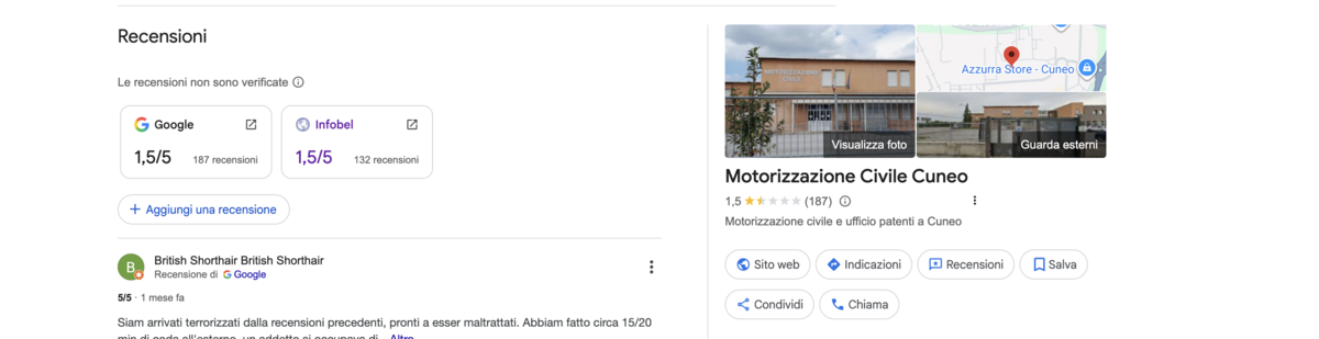 Se il voto complessivo delle recensioni (ben 187) per la Motorizzazione Civile di Cuneo è 1,5, un motivo ci sarà.
