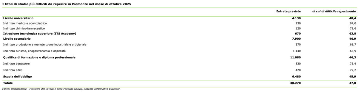 Delle 30.270 entrate previste in Piemonte nel mese di ottobre 2025 il 14% costituito da laureati, il 26% da diplomati, le qualifiche o diplomi professionali e la scuola dell’obbligo pesano rispettivamente il 37% e il 21%.