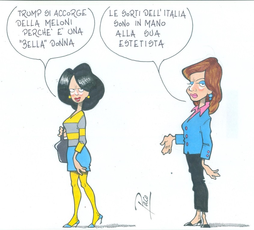 A Sharm el -Sheikh Trump si accorge che c'è una donna, la nostra Giorgia, si gira...la cerca dalla sua "altezza"...abbassa lo sguardo e le dice che, tutto sommato, è una bella gnocca. Lei sorride contenta. Teniamoci buona la sua estetista