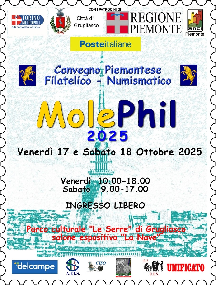 Partita oggi negli spazi del Parco espositivo “La Nave” di Grugliasco, proseguirà anche nella giornata di domani (sabato 18 ottobre, dalle ore 9 alle 17) la seconda edizione dell'evento filatelico-numismatico "Molephil. Convegno Nazionale del Nord Ovest".