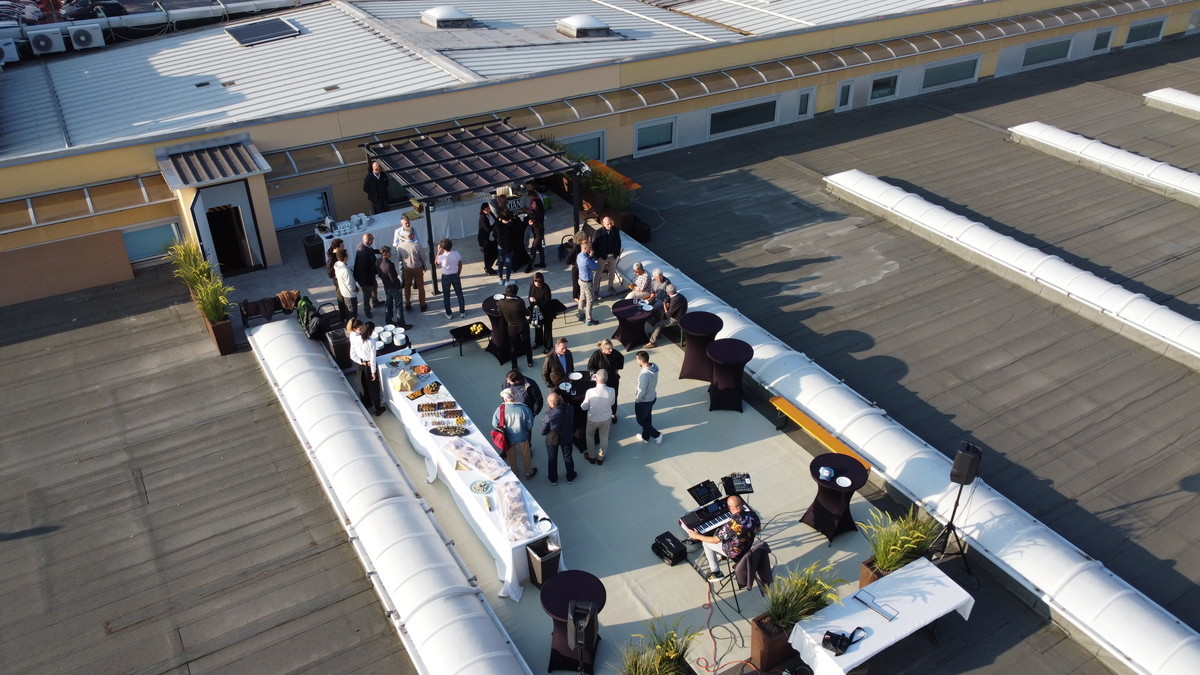 Per la festa di inaugurazione, i due titolari hano organizzato un pomeriggio di festa sul tetto dell'edificio, allestito per ospitare le decine di persone intervenute per condividere la bellissima tappa professionale, che corona anni di lavoro, impegno e soddisfazioni anche in campo internazionale.