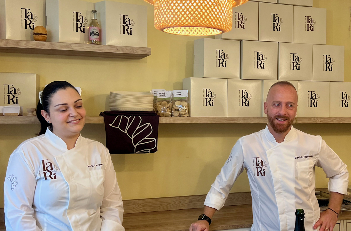 Non sono state affatto poche, nell’ora e mezza che ho trascorso da Tarì – Cake Lab Viennoiserie, le persone che si sono fermate di fronte alla vetrina che, dalla strada, consente di gettare un occhio sul bancone della singolare pasticceria posta quasi all’angolo tra via Mazzini e via San Massimo, tentando magari di entrare a dispetto della chiusura del locale. Dietro al bancone, a spiegarci il modo in cui concepiscono la pasticceria e i prodotti che da questa filosofia sono nati, c’erano Maria Tamburrano e Giacinto Rignanese, giovane coppia che da nemmeno un anno ha deciso di dar vita qui a un piccolo laboratorio, trasformandolo in un crogiolo di sogni e progetti avvolti dal loro stesso entusiasmo. Lui, ex calciatore, ha lasciato il campo per dedicarsi alla pasticceria, portando la stessa determinazione e disciplina che lo hanno accompagnato nello sport. Lei lo affianca con entusiasmo e comunicatività, creando un duo affiatato sia in laboratorio che nella gestione del progetto. Che, in meno di un anno, ha dato loro soddisfazioni che non si attendevano.