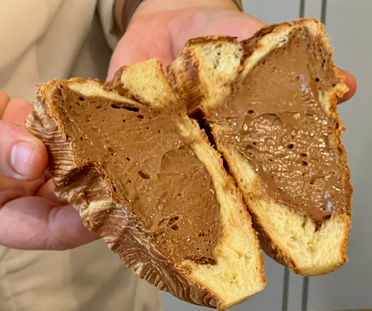 Certo, quando vedrete le dimensioni piuttosto consistenti di questa particolare viennoiserie, qualche dubbio immediatamente vi verrà. Non fidatevi però delle apparenze e, sui piccoli sgabelli che il locale mette a disposizione o nel bar vicino se vorrete accompagnarli con un caffè, assaggiateli con calma. Scoprirete profumi e sapori che vi faranno ritornare. Ma, viste le code che si formano soprattutto il sabato e la domenica, preparatevi a non essere i soli.