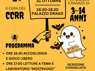 Il Consiglio Comunale dei Ragazzi e delle Ragazze (CCRR) invita tutti i bambini e i ragazzi dai 03 ai 14 anni a un pomeriggio "mostruosamente" divertente per festeggiare insieme Halloween ! Tra giochi, travestimenti, letture e laboratori, Palazzo Drago si trasformerà in un piccolo mondo da "brividi", dove streghe, fantasmi e zucche sorridenti saranno i protagonisti. Un'occasione per stare insieme, divertirsi e condividere l'allegria di una festa pensata dai ragazzi...... per i ragazzi !