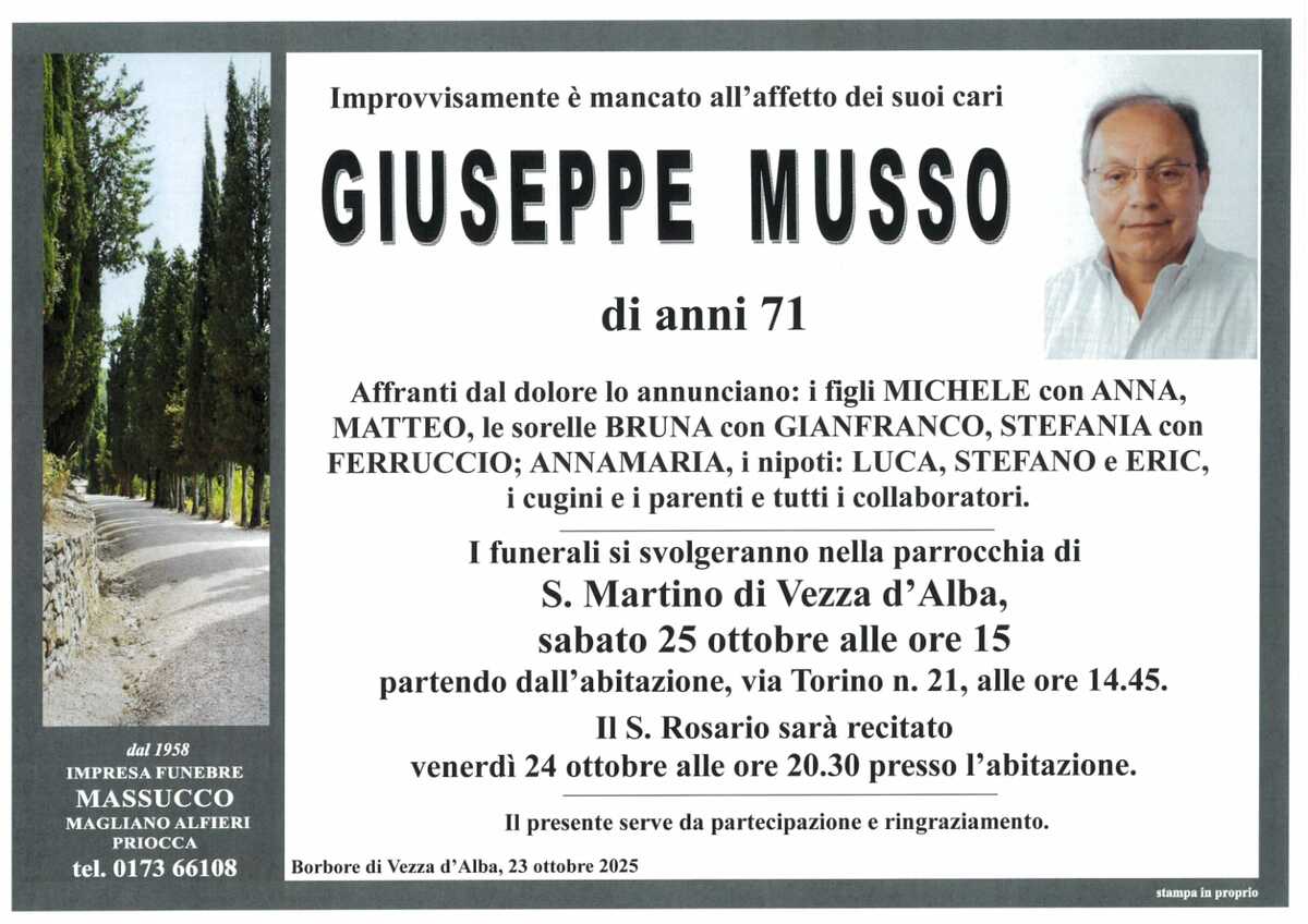 Persona molto attiva, Musso faceva parte del Lions Club Canale-Roero e del Gruppo Alpini di Vezza d’Alba, che hanno già manifestato il loro dolore e la vicinanza alla famiglia, come ha provveduto a fare l’Amministrazione Comunale, per la quale Giuseppe era un riferimento importante e stimato.