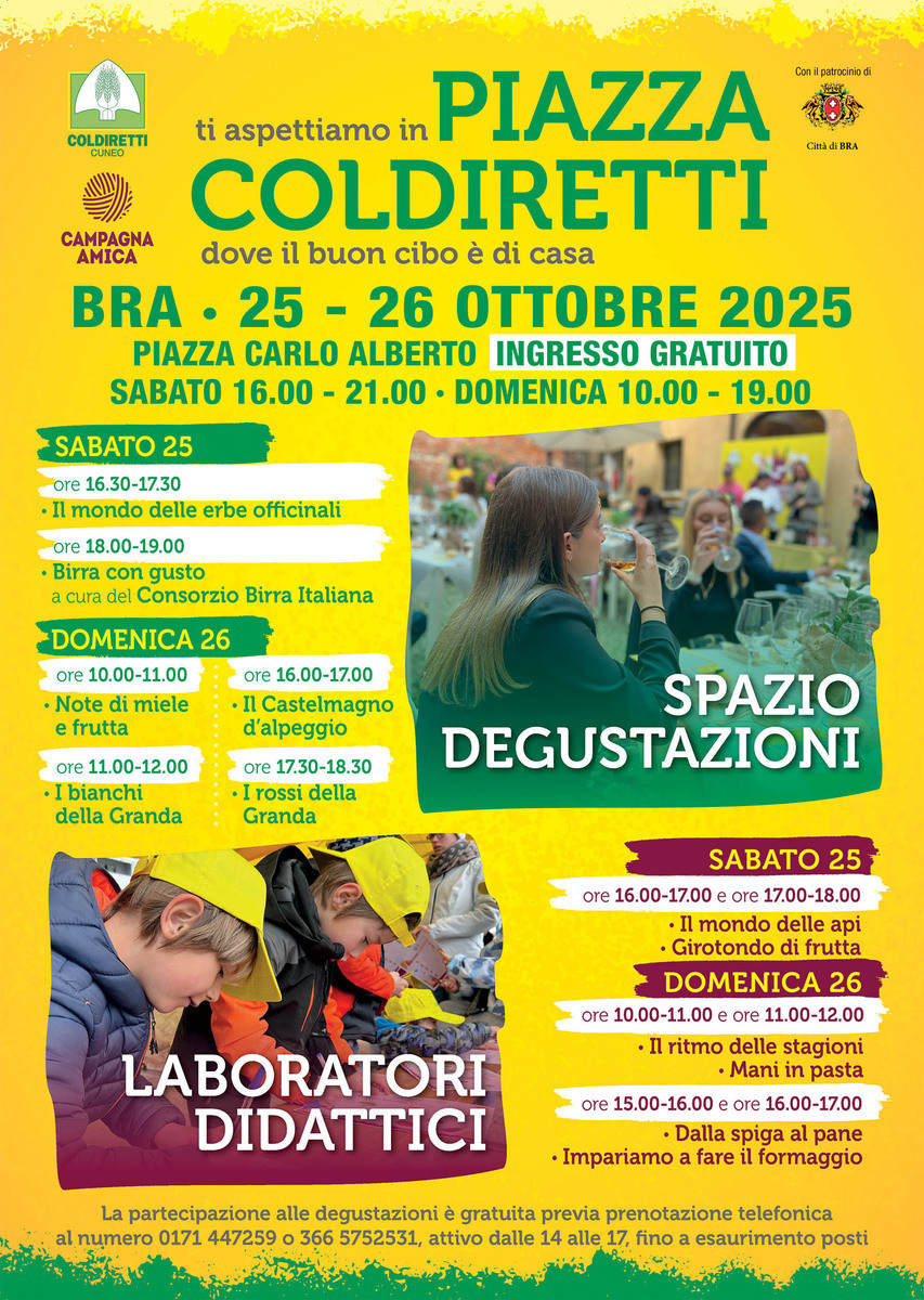 Un weekend all’insegna del gusto, della tradizione e del divertimento: il 25 e 26 ottobre Bra si tinge di “giallo Coldiretti” con Piazza Coldiretti, dove il buon cibo è di casa, il primo festival di Coldiretti Cuneo pensato per far conoscere le eccellenze agricole del territorio e vivere insieme momenti di convivialità.