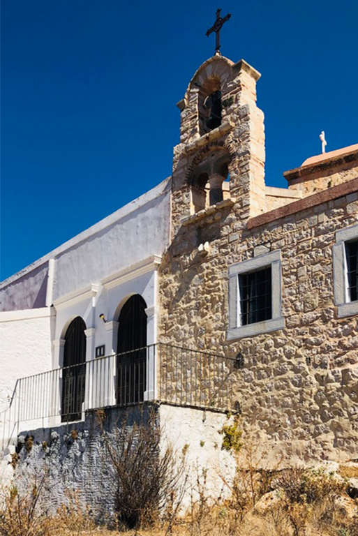 Pochi metri più in alto, una piazzetta si apre all’improvviso: tavoli di legno, un muro bianco con una sola parola scritta in nero — “Mediterraneo”. È impossibile non pensare al film di Gabriele Salvatores, girato qui e premiato con l’Oscar. Una storia di uomini sospesi tra la guerra e una terra remota che li disarma, prima ancora di accoglierli. Quella scritta non è decorazione: è memoria sedimentata, più incisiva di qualunque brochure. Attorno, muri scrostati e facciate restaurate convivono senza spiegazioni; la scena è vuota e viva allo stesso tempo, come se qualcuno dovesse comparire da un momento all’altro. Poco distante si trova la Santrapeia School, fondata nel 1903 della diaspora greca che è uno degli edifici simbolo di Kastellorizo. La sua architettura neoclassica, con colonne e timpano, testimonia il periodo di grande sviluppo a inizio Novecento, quando cultura e commercio fiorivano grazie alla posizione strategica e al momento storico. Oggi l’edificio resta un punto di riferimento solo identitario per gli abitanti.