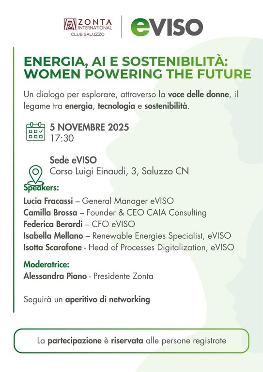 Con questo appuntamento, eVISO e Zonta Saluzzo condividono un percorso comune di consapevolezza, mettendo in luce l’importanza del contributo femminile nella transizione verso modelli energetici e tecnologici più efficienti e responsabili.