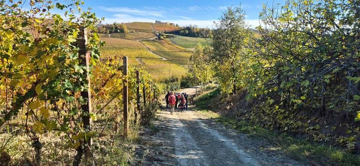Siamo partiti da Sinio, un bellissimo borgo dalla forma rettangolare, visto dall'alto, e abbiamo raggiunto Roddino, godendo di una meravigliosa tavolozza di colori con vigneti e piccoli boschetti. Successivamente, a Serralunga d'Alba, dominata dal suo castello, abbiamo trovato il luogo ideale per il pranzo al sacco e un chioschetto per il caffè, ottima opportunità per i numerosi escursionisti. Scollinando per l'ultima volta per tornare a Sinio, non potevamo non fermarci a gustare un gelato alla nocciola in un'azienda agricola locale.