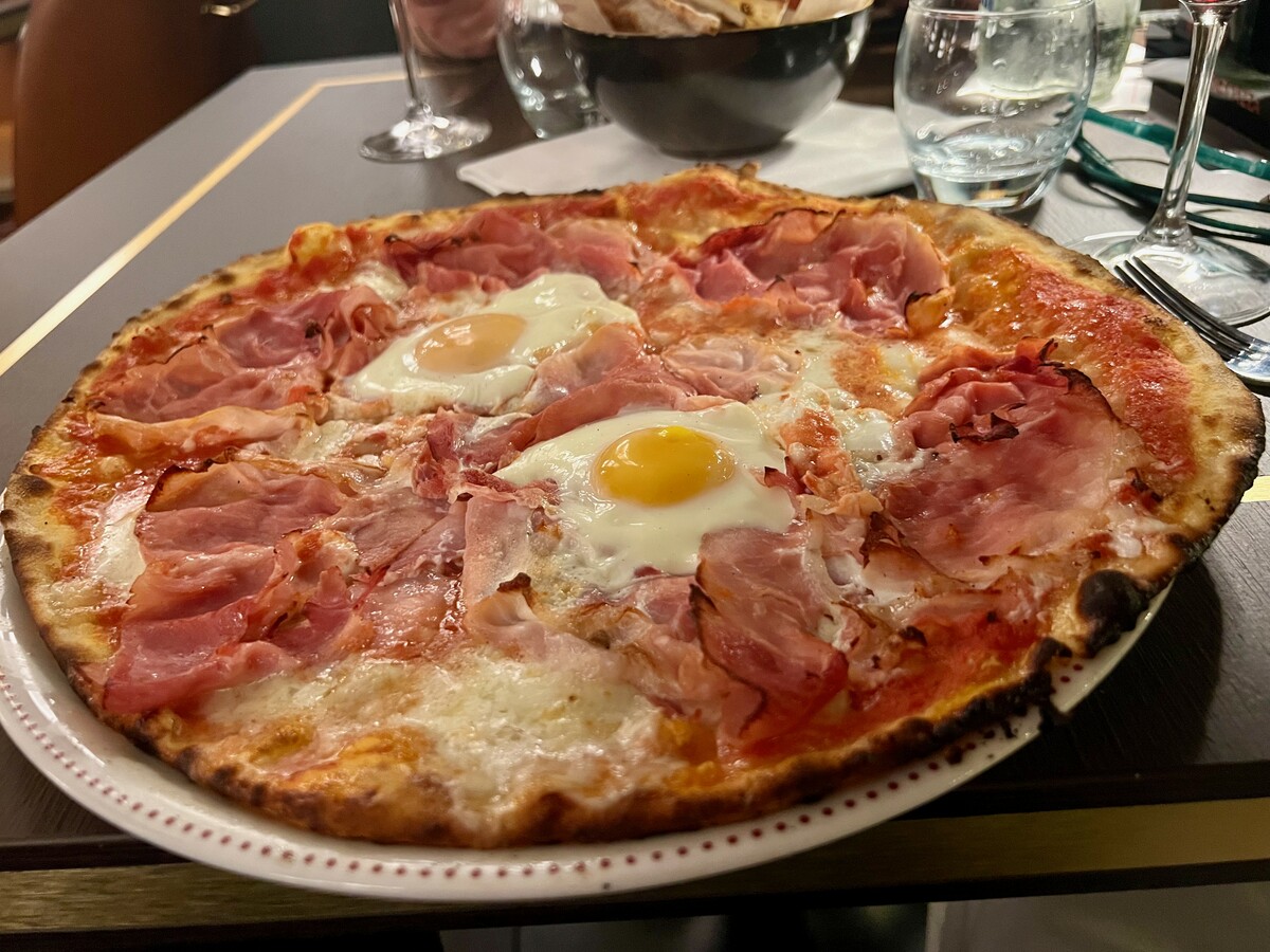 Comme il faut la Pizza alla Bismark: impasto sottile e leggero, croccante fino al bordo quasi assente, uova cotte al punto giusto e sapore pieno, già porzionata, da gustare fino all’ultimo morso.