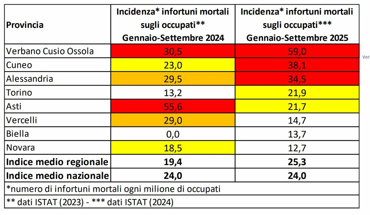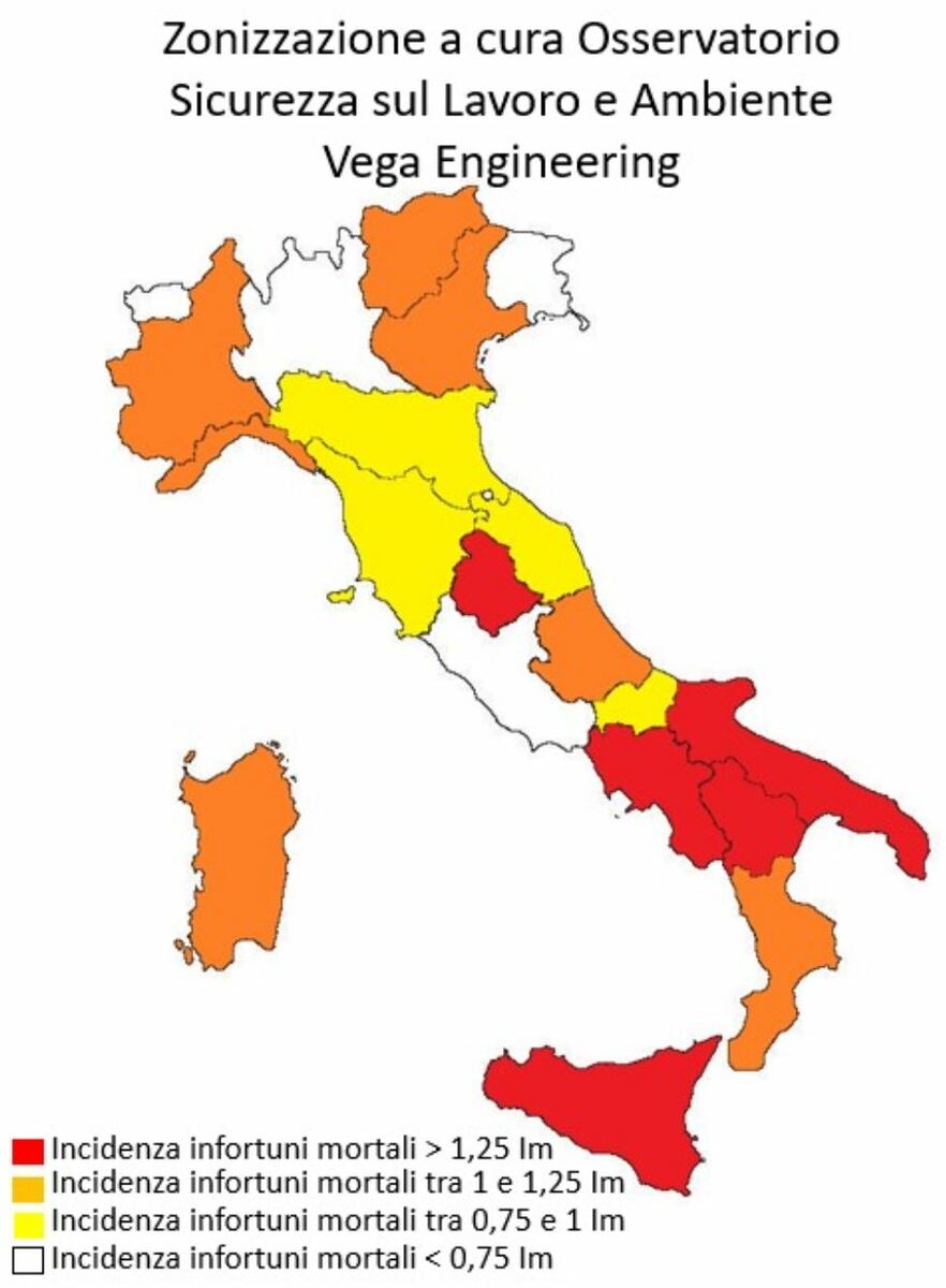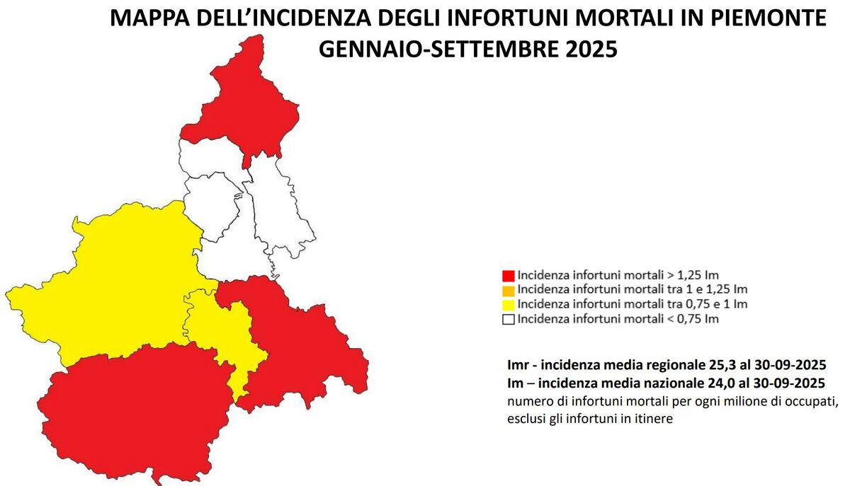 A finire in zona rossa a settembre 2025, con un’incidenza superiore a +25% rispetto alla media nazionale (Im=Indice incidenza medio, pari a 24 morti sul lavoro ogni milione di lavoratori), Basilicata, Umbria, Campania, Puglia e Sicilia, mentre il Piemonte continua a permanere in zona arancione secondo la classificazione dell’Osservatorio Sicurezza sul Lavoro Vega, guadagnandosi l'11° posto su base nazionale, con un'incidenza di 25,3 e 47 casi su 1.854.204 occupati annuali, a esclusione degli infortuni in itinere.