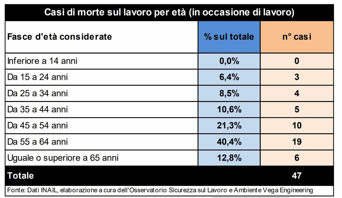 Nei primi nove mesi del 2025, guardando alle vittime in occasione di lavoro, maggiormente a rischio sono i lavoratori over 65, con un’incidenza che sale da 47,3 a 78,0 morti per un milione di occupati, e la fascia tra i 55 e i 64 anni (da 24,6 ad agosto a 37,5 a settembre, con 200 vittime su un totale di 575), seguita dalla fascia di lavoratori tra i 45 e i 54 anni (24,6). Nello specifico, in Piemonte si registrano 6 casi per gli over 65 (12,8% sul totale), 19 casi per la fascia tra i 55 e i 64 anni (40,4%) e 10 casi per la fascia 45-54 anni (21,3%).