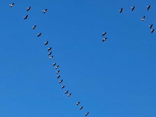 Le gru cenerine migrano in grandi gruppi formando una "V" durante il loro volo. In questo periodo, visto l'imminente inverno, sono dirette verso sud .
