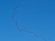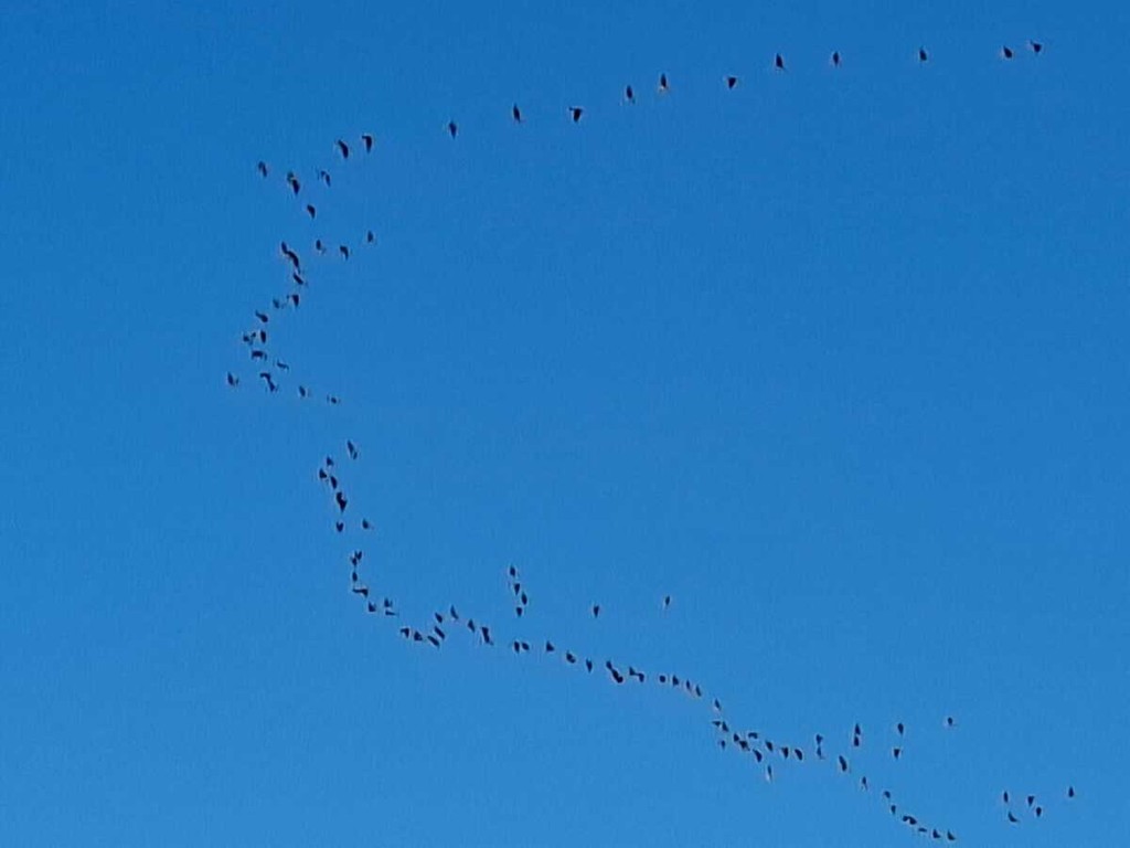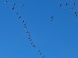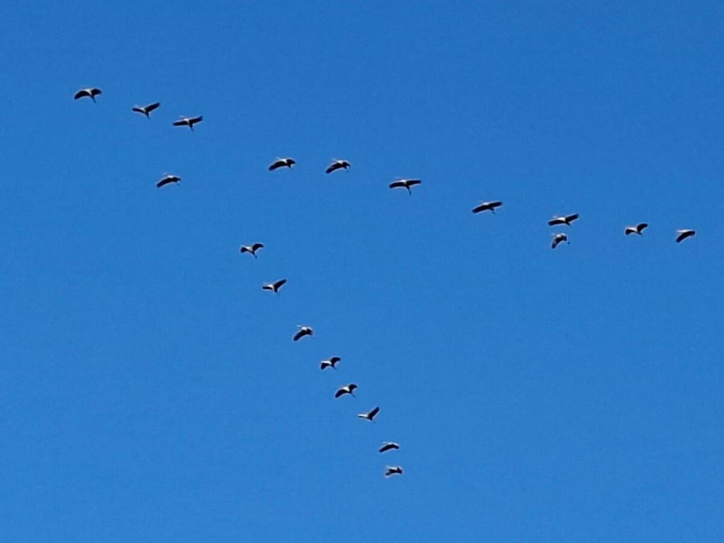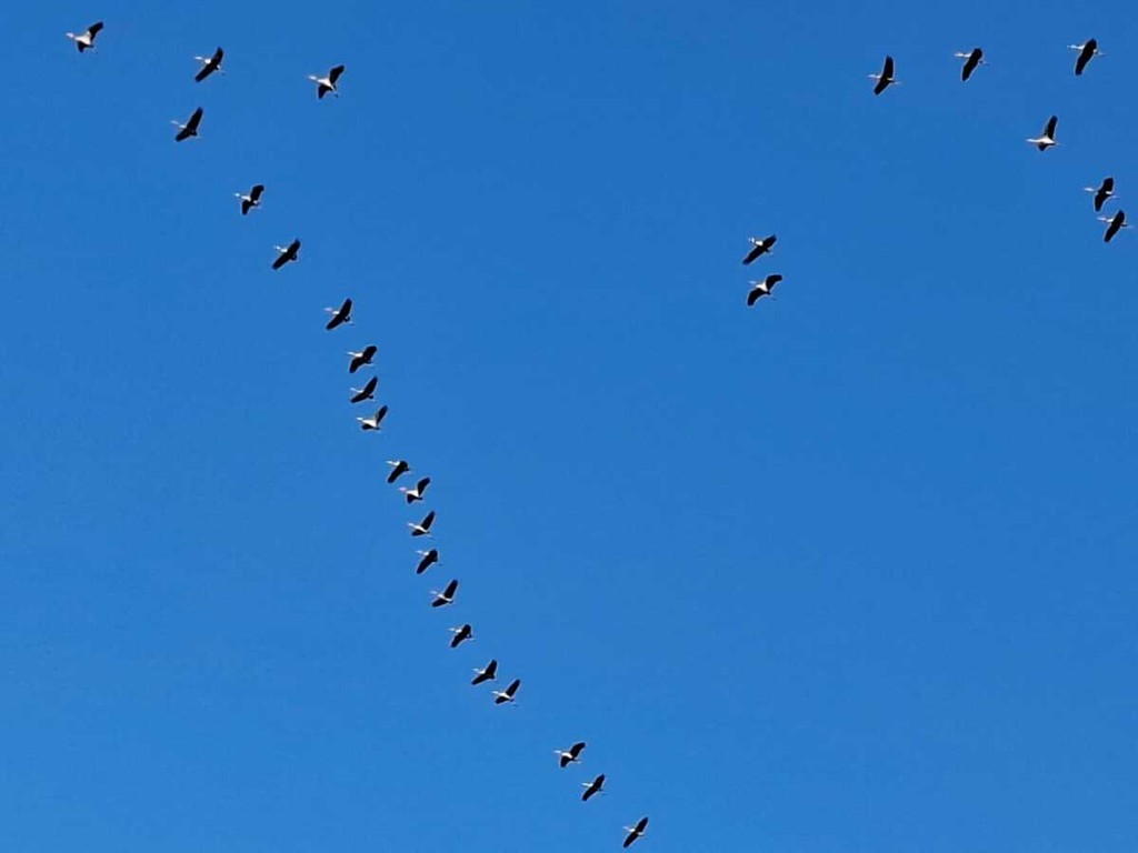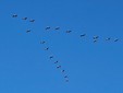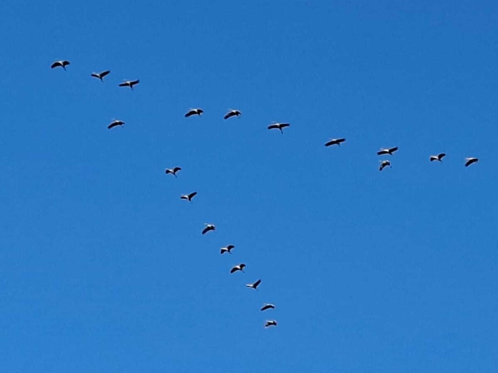 Le gru cenerine migrano in grandi gruppi formando una "V" durante il loro volo. In questo periodo, visto l'imminente inverno, sono dirette verso sud .
