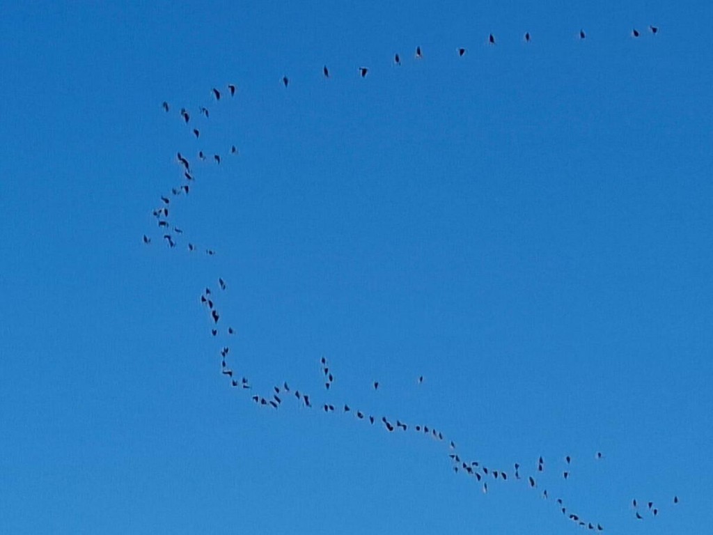 Tutti con il naso all’insù per ammirare le evoluzioni di uno stormo di gru cenerine, perfettamente visibili sia nel capoluogo che a Borgo San Dalmazzo.