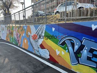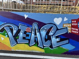 L'opera, inaugurata oggi, è un'esplosione di colori, dove campeggia il simbolo della pace, ricordata nelle quattro lingue dei paesi gemellati, insieme a fiori, volti di giovani e una gomma che invita a "cancellare" i conflitti.