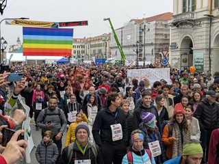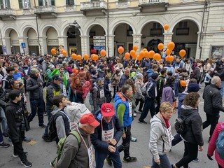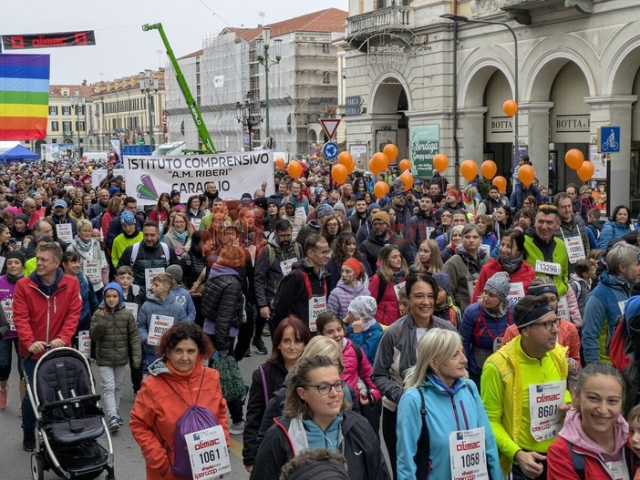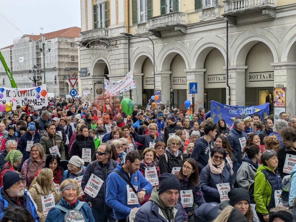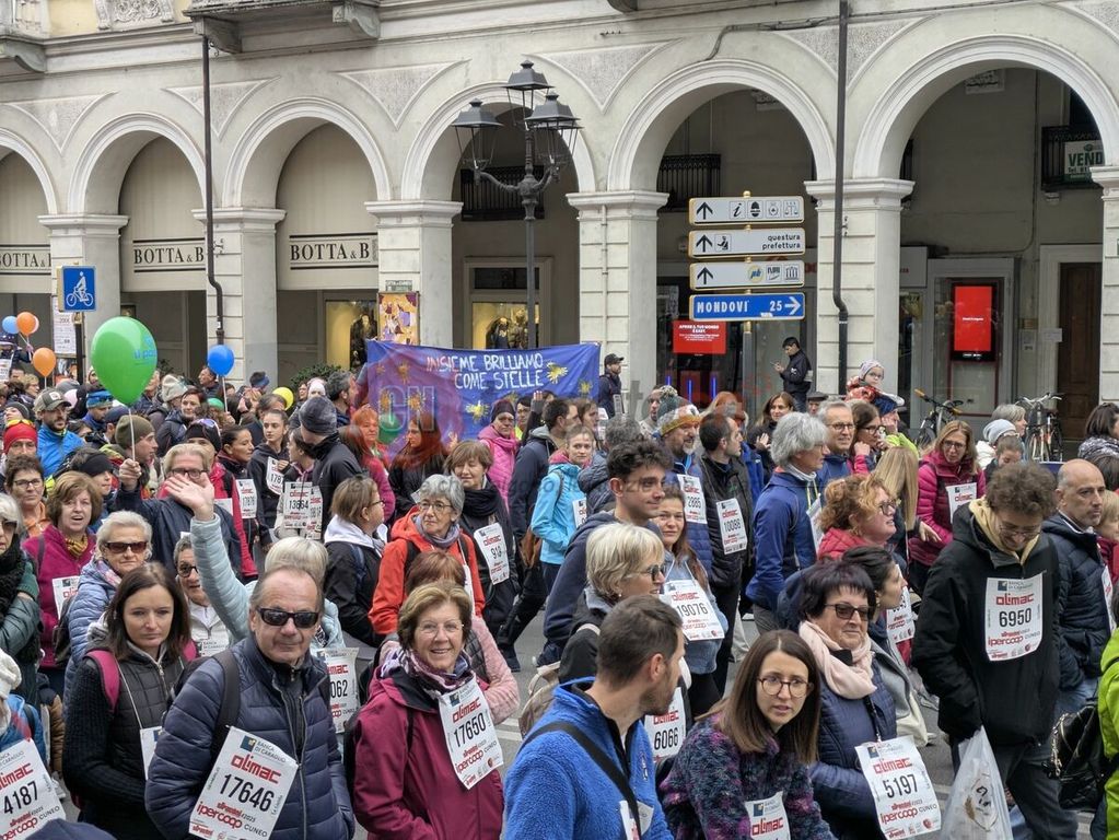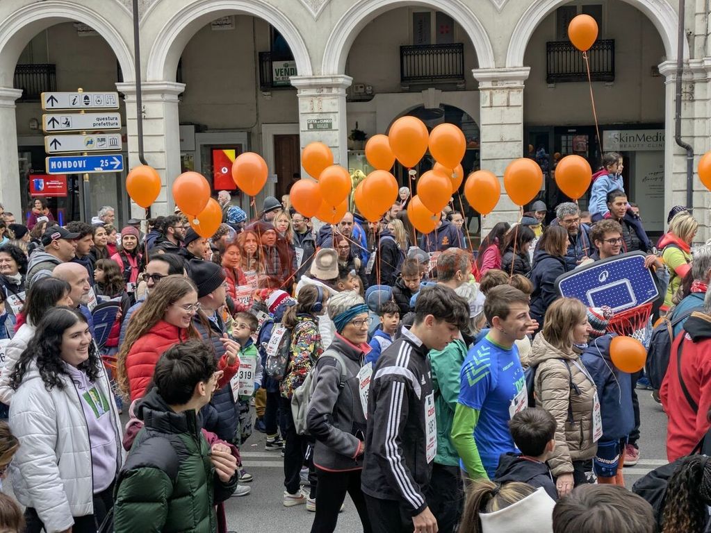Piazza Galimberti già verso le 8.30 era un mosaico di colori: magliette arancioni, palloncini, bambini sulle spalle dei genitori, cani al guinzaglio con la pettorina ufficiale.