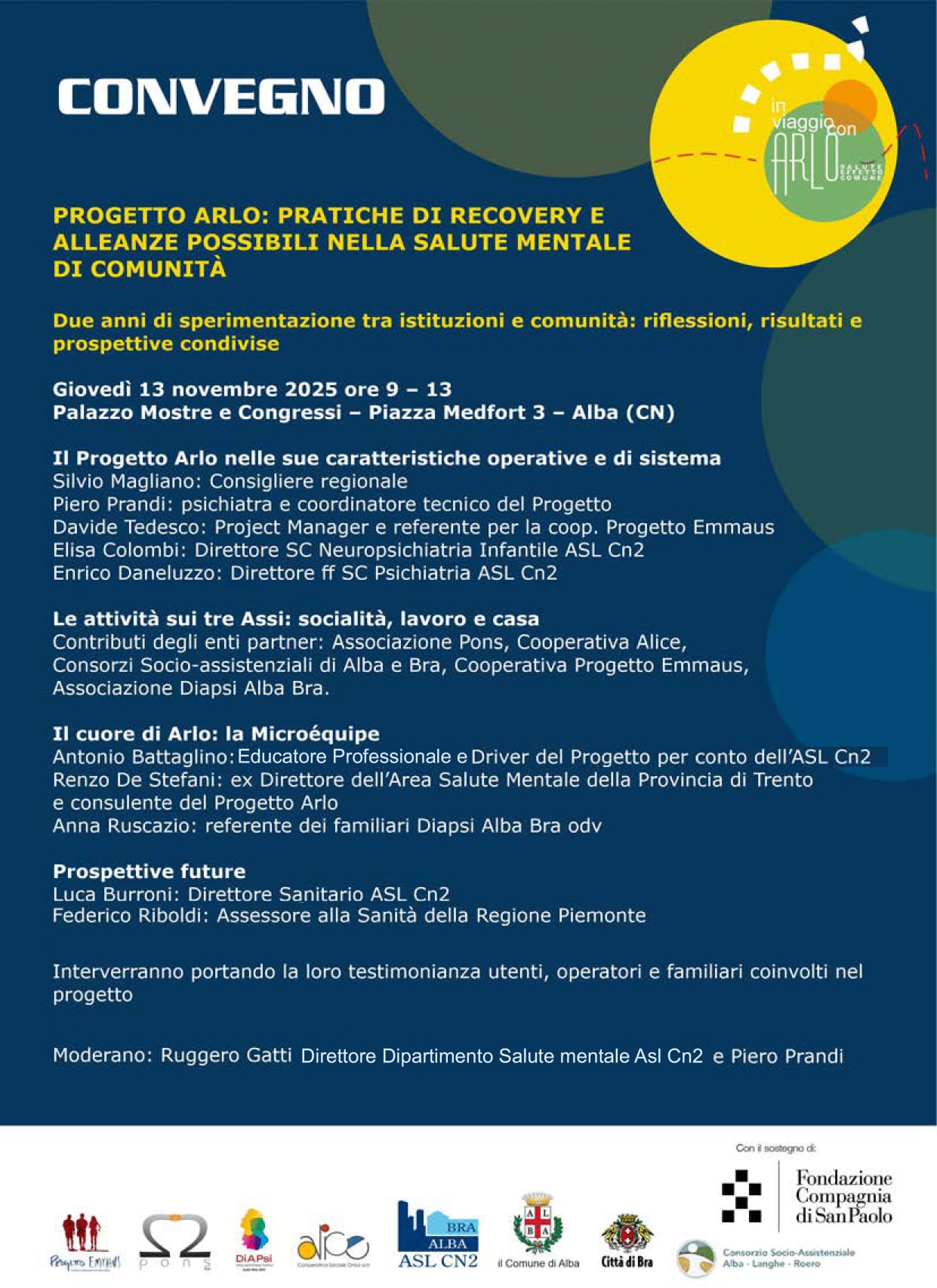 La seconda parte della mattinata sarà dedicata alle attività sui tre assi principali – socialità, lavoro e casa – con contributi di associazioni e cooperative partner, mentre nel segmento “Il cuore di Arlo” si alterneranno testimonianze degli operatori e dei familiari coinvolti, con Antonio Battaglino, educatore professionale dell’ASL CN2, Renzo De Stefani, ex direttore dell’Area Salute Mentale della Provincia di Trento e consulente del progetto, e Anna Ruscazio per Di.A.Psi. Alba Bra. A concludere i lavori saranno Luca Burroni, direttore sanitario ASL CN2, e Federico Riboldi, assessore regionale alla Sanità, con il coordinamento di Ruggero Gatti, direttore del Dipartimento di Salute Mentale ASL CN2.