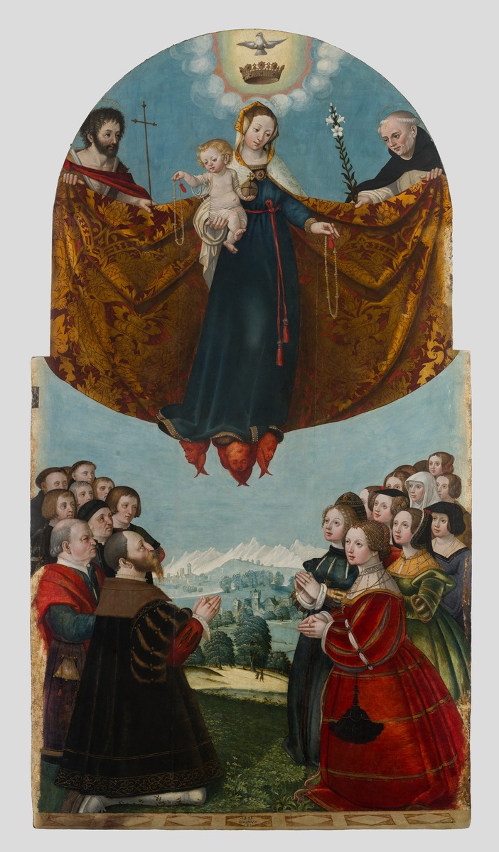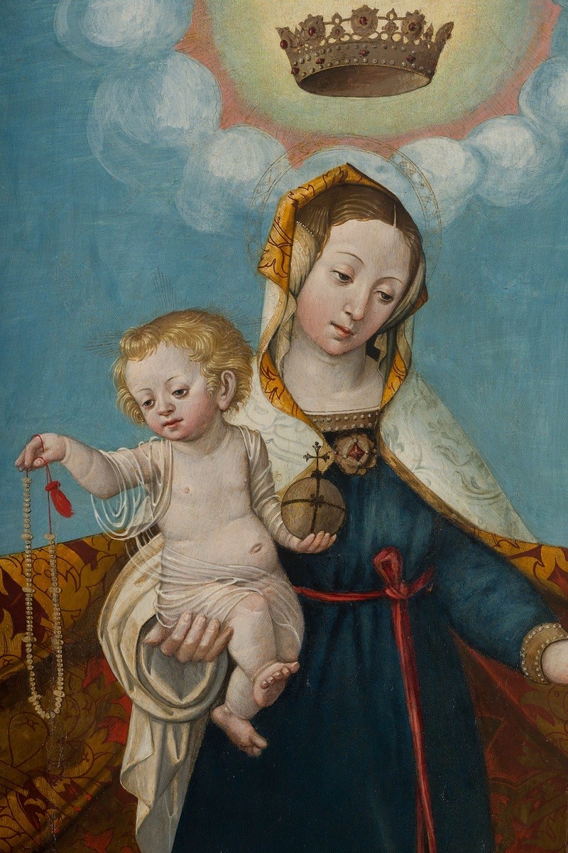 L’importante retablo, datato 1535 e firmato, appariva come un polittico ad ante mobili, i cui laterali erano dipinti su entrambi i lati: nei giorni di festa era aperto e mostrava al fedele l’immagine della Madonna del Rosario venerata dal marchese Francesco di Saluzzo e dalla sua corte, con intorno i Misteri. Sul lato festivo delle portelle, a polittico aperto, erano e sono rappresentate Storie di Ester e di Giuditta. Al centro della predella era ed è raffigurato l’assedio di Saluzzo del 1487 da parte delle truppe di Carlo I di Savoia.