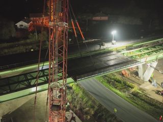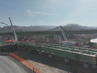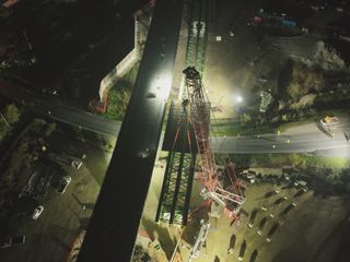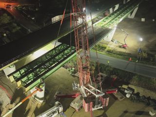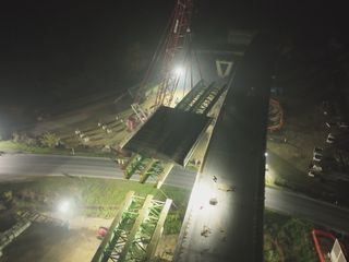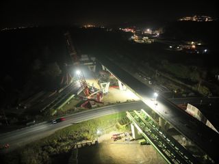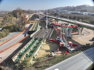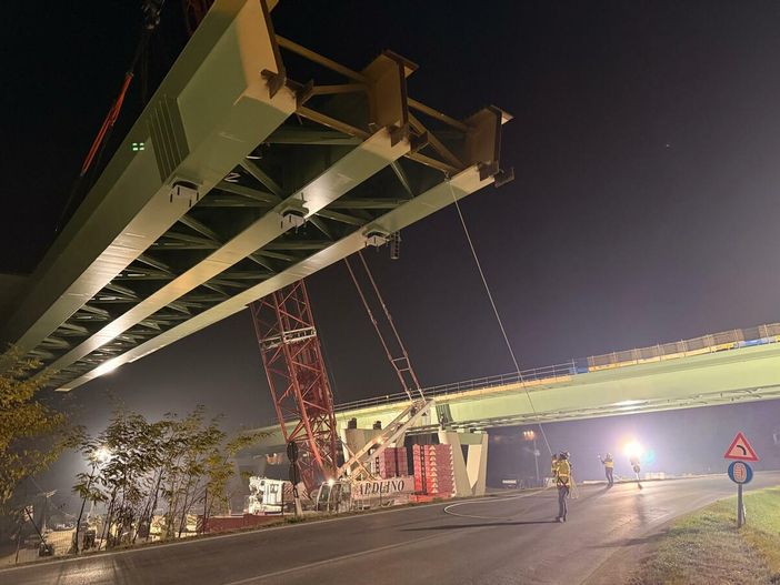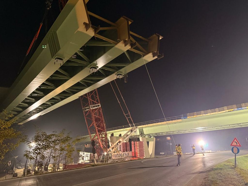 Con una luce di 50,10 metri e un peso complessivo di circa 220 tonnellate, l’impalcato preassemblato a terra è stato sollevato da una gru da 800 tonnellate e posizionato mediante una lenta rotazione in quota. Come per il primo varo, l’elemento è stato installato con le predalles metalliche già montate, al fine di ridurre al minimo le interferenze con la viabilità nelle successive fasi di completamento.