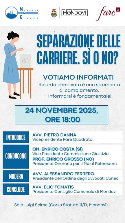 La Sala Comunale delle Conferenze "L. Scimè" ospiterà, infatti, due relatori d'eccezione: da una lato il prof. Enrico Grosso, presidente onorario del Comitato Nazionale per il NO al referendum sulla Separazione delle Carriere, dall'altro l'on. Enrico Costa, deputato monregalese, Vicepresidente della Commissione Giustizia della Camera e da anni impegnato nella riforma della giustizia.