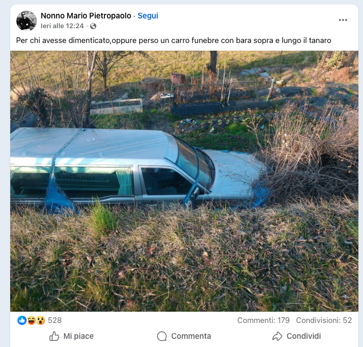 "Per chi lo avesse dimenticato oppure perso un carro funebre con bara sopra e lungo il Tanaro". È quanto si legge in un post di Facebook, corredato da foto del suddetto veicolo con annessa bara sulla quale si riesce a leggere la scritta "Giraudo". Il post in questi giorni è stato condiviso da diversi gruppi Facebook. Tra questi anche "Sei di Alba se...", dove tra like e commenti ha scatenato centinaia di reazioni di utenti intenti a sorridere della singolarità del fatto e a interrogarsi sull'effettiva attendibilità dell’immagine.