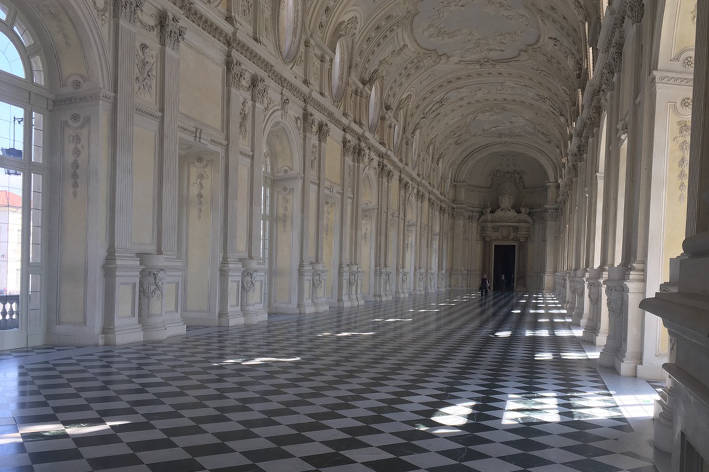 Fuori, c’è la piazza con la Torre dell’Orologio che segna il confine con il Borgo. Le vecchie caserme oggi ospitano caffè, librerie, mostre. Le strade dove passavano cavalli e servitori ora accolgono famiglie, studenti, turisti. Una cittadina viva che rappresenta un luogo attuale. La bellezza non è più esclusiva, è condivisa. Al tramonto, i mattoni diventano rame e la luce scivola lenta sui portici. Le persone si fermano a guardare, qualcuno fotografa, altri restano in silenzio. La Reggia, immobile, sembra respirare davvero: non come un monolite, ma come un organismo che ha imparato a convivere con la propria memoria. Visitare questo luogo non significa soltanto attraversare la storia dei Savoia, ma comprendere un’idea di potere tradotta in proporzioni e in spazio. Qui la forma è sostanza, e la misura è linguaggio!