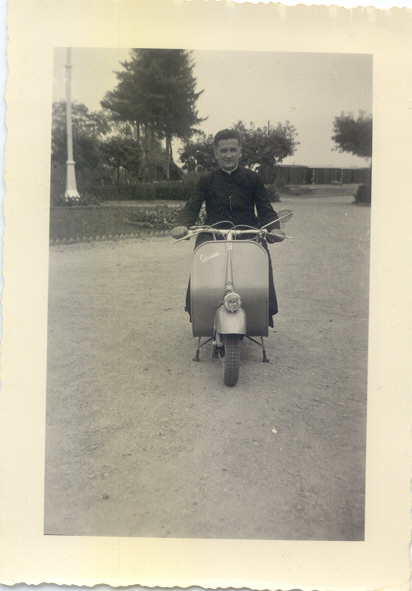 In una vecchia fotografia, molto popolare, lo si vede alla guida di una Lambretta: riporta la memoria all’Italia degli anni ’60, in pieno boom economico.
