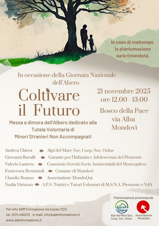 In occasione della Giornata Nazionale dell’Albero, venerdì 21 novembre 2025, dalle 12 alle 13, il Bosco della Pace di via Alba a Mondovì ospiterà l’iniziativa “Coltivare il Futuro”, una cerimonia di messa a dimora di una pianta dedicata alla tutela volontaria dei minori stranieri non accompagnati. Si tratta di ragazzi arrivati in Italia senza genitori né familiari di riferimento, ai quali la legge riconosce il diritto a un tutore volontario: una figura adulta che li accompagna nel loro percorso di integrazione, tutela i loro diritti e li sostiene nelle scelte quotidiane.